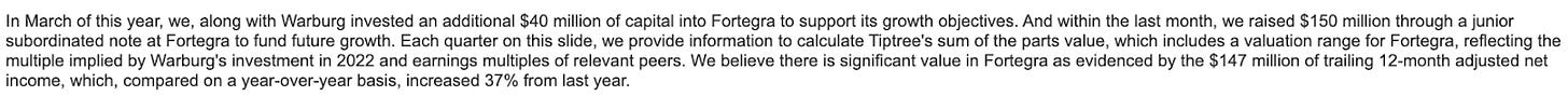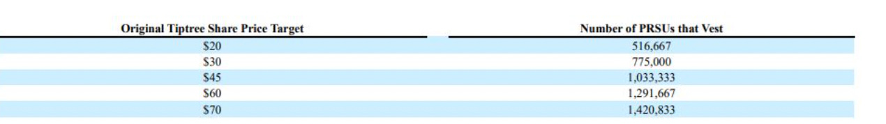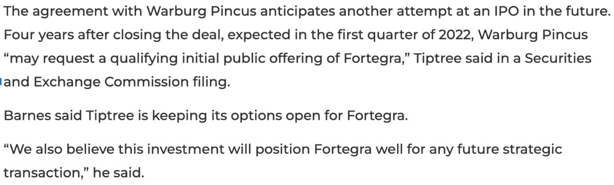 I really like TIPT, but I would be shocked if this sold for more than 15x EPS. 15x $150m = $2.25bn * 70% fully diluted ownership = $1.575bn to TIPT. This has zero tax basis, so 21% corporate tax burden would yield $1.244bn in cash to TIPT. IMHO, 100% of the value of TIPT is Fortegra. This would have at least a 20% holdco discount = $1bn valuation proforma for a divestiture at 15x EPS after tax after assuming a very modest 20% holdco discount. I've seen 30-40% holdco discount frequently in these types of situations. A 20% holdco discount implies a $27 PT. If Fortegra was sold for 12.5x, that would imply a $22.50 stock.