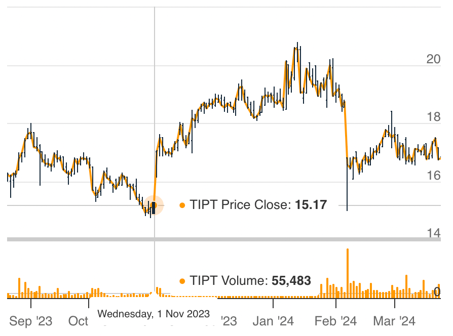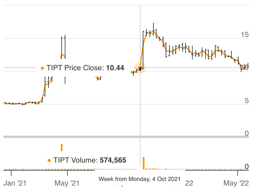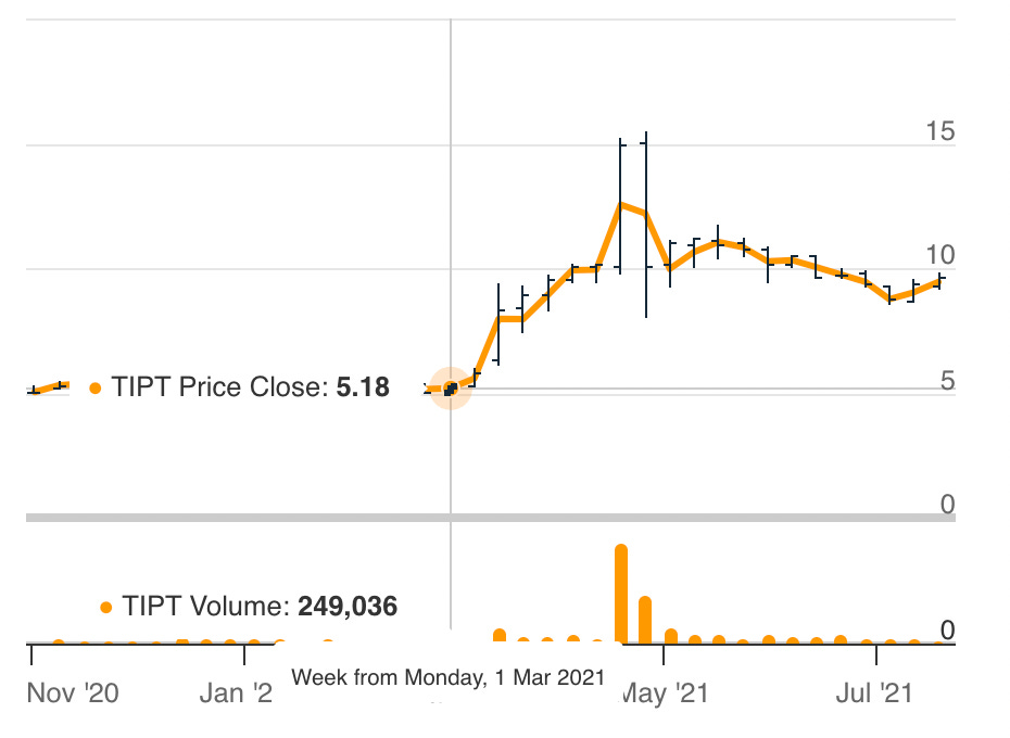 When Warburg announced its initial investment into Tiptree (and Fortegra IPO plans) in March 2021, the stock moved 300% over the course of several months. This coincided with a large spike in volume: