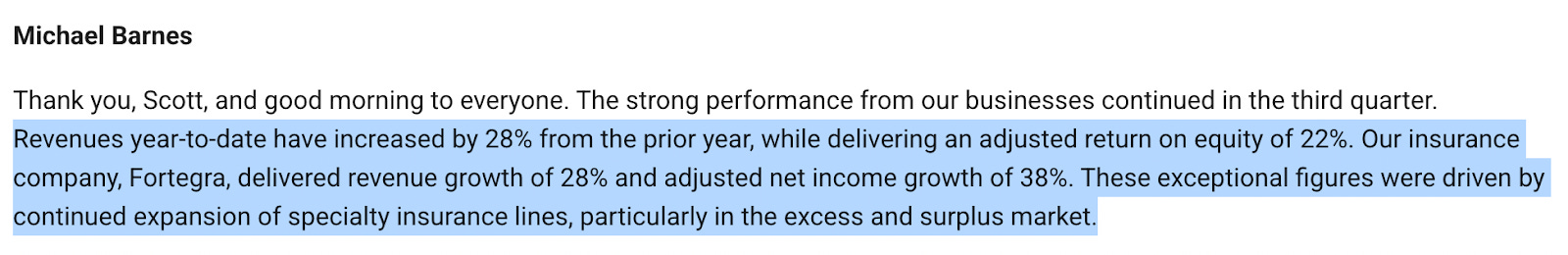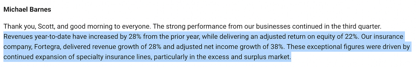 $TIPT owns Fortegra, which for all intents and purposes is the whole company (it sold off various assets over the years, so now this division contributes 95% of the company’s revenues). For this trade, it’s not actually too important to go into the minutiae of the business. Essentially Fortegra provides niche insurance products, particularly in E&S. The business has been executing better than nearly all comps over the last 5 years. This is a great overview from @BoujeeBanker on Fintwit. CEO Michael Barnes further highlights the execution story below: