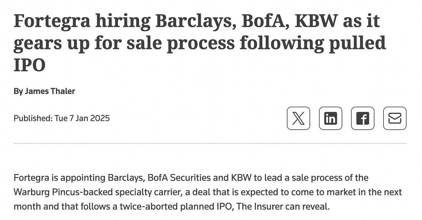 In 2021, Warburg Pincus invested $200m in Fortegra for a 24% ownership stake, valuing the business at 13.5x EV/EBITDA or $833m. The plan was to IPO the business, but the 2021 IPO failed (despite a credible syndicate led by Goldman). Warburg wanted an insanely bullish valuation of $1.5 billion, despite Covid uncertainty and much higher hype around “tech-enabled” insurers like Lemonade. Another attempt at an IPO was pulled in early ‘24, due to market conditions.